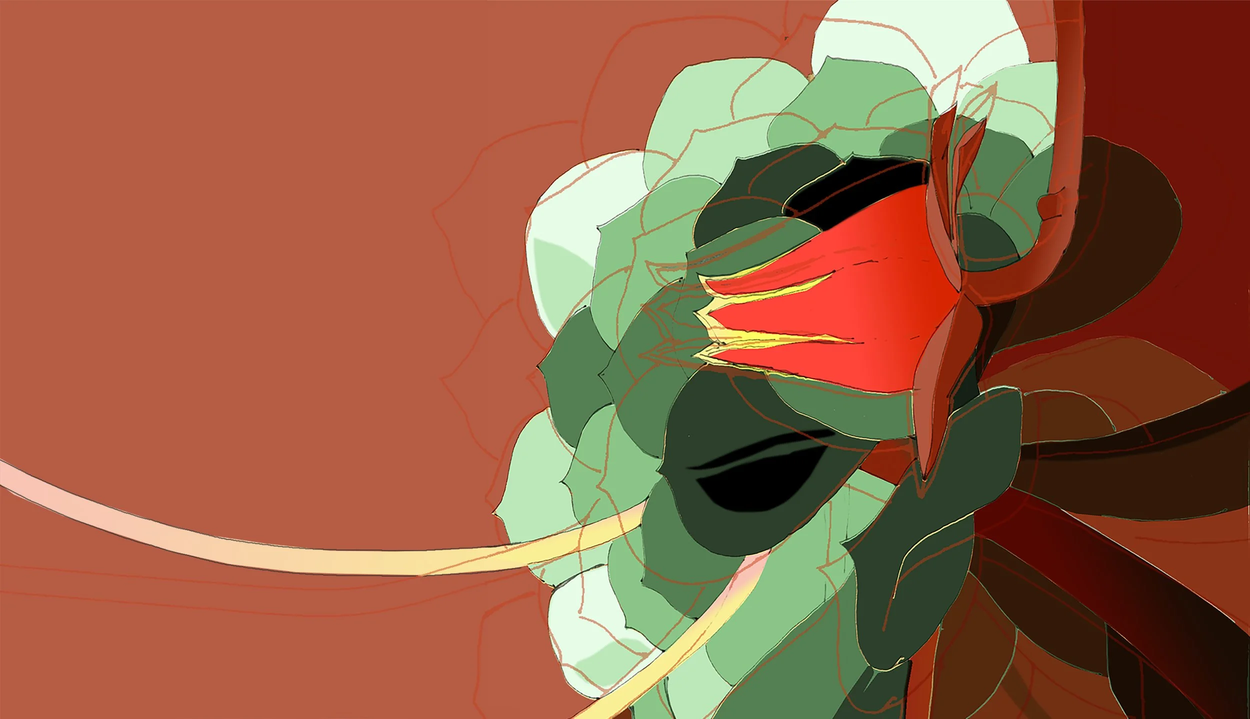 A close-up photo of a flowering cacti plant was digitally manipulated, layered and colour-enhanced to create an evocative, abstracted version of the original photo.
